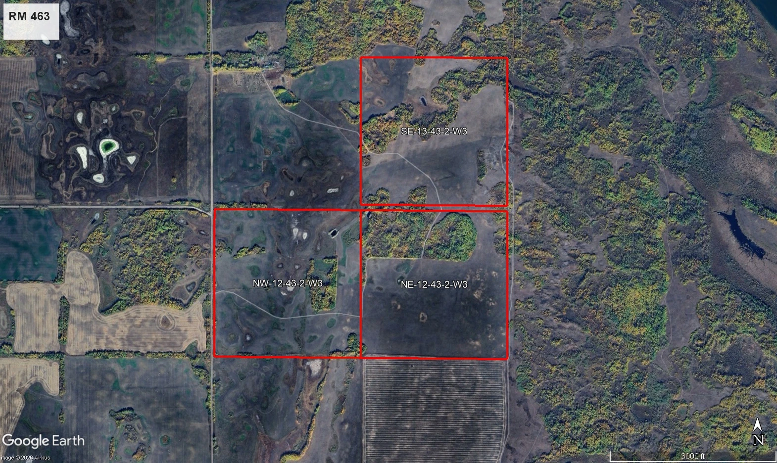 This offering consists of 480 title acres (3 parcels) with a blend of cultivated land, pasture, and bush. The property includes some bush, sloughs, and stones, typical of the area.